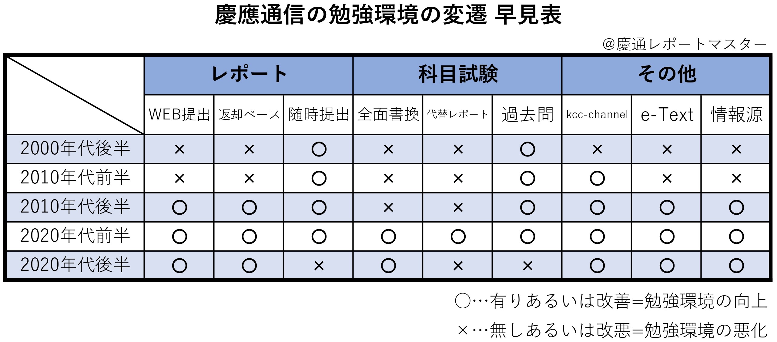 この表が示す通り、慶應通信の勉強環境は、5年スパンで大きく改善されています。